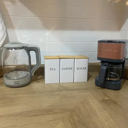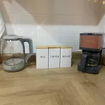 Cozinha equipada com máquina de café/chá, refrigerador e utensílios de cozinha está disponível como parte das comodidades auto-suficientes deste apartamento.